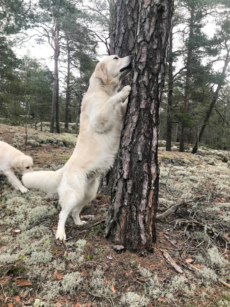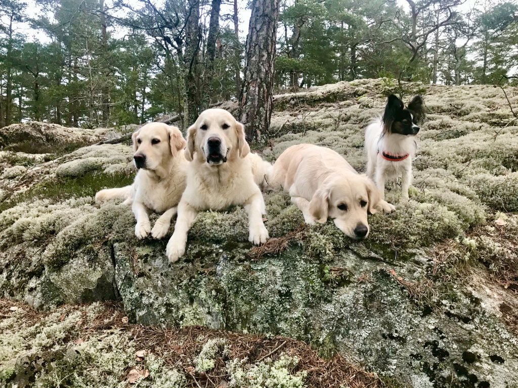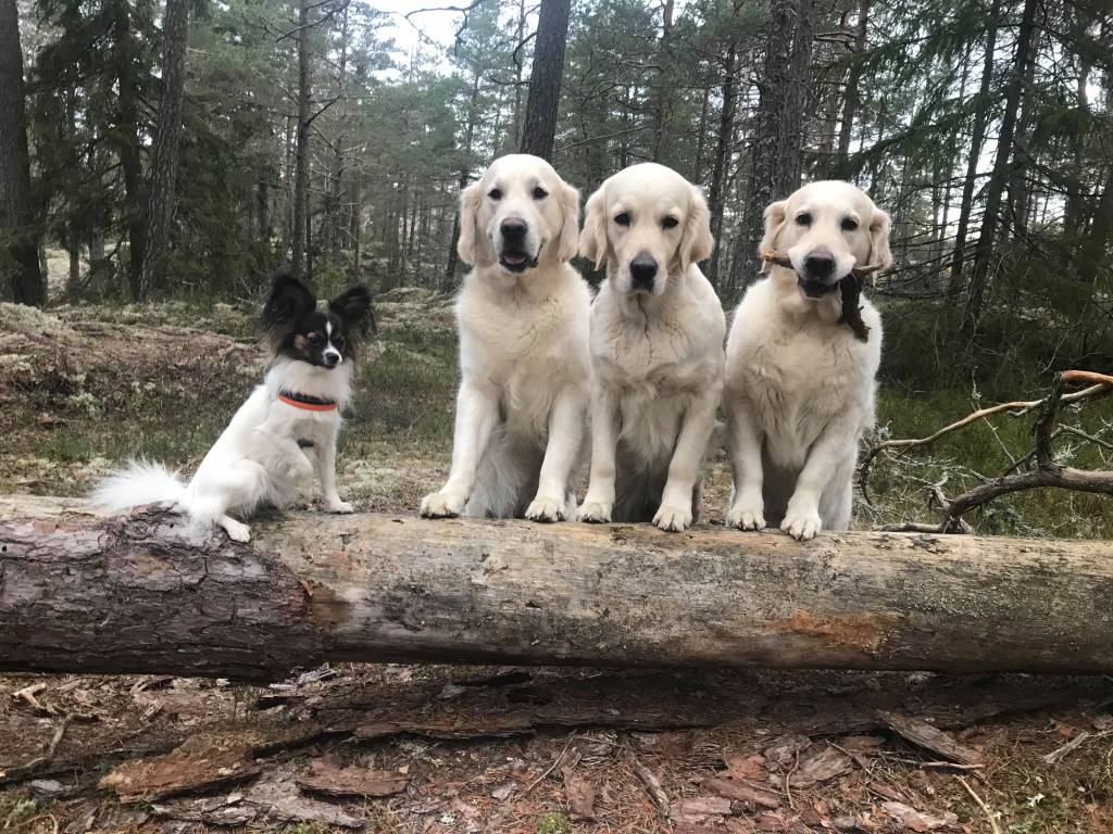 Från vänster: Skye, Lazer , Rosie och Mira 14 mån (papillon) Det är en härlig morgon promenad med hundarna, det är några minus grader och det är frost på marken och jag hör fåglarna kvittra, det är så mysigt. För att göra promenaden lite roligare för hundarna har jag gömt små godisbitar i barken på ett träd och på marken.. Här söker Lazer efter godiset som är gömd i barken och Skye söker efter godis i mossan. Balansakter på stock och sten är också roliga lekar när man är ute på promenad..
