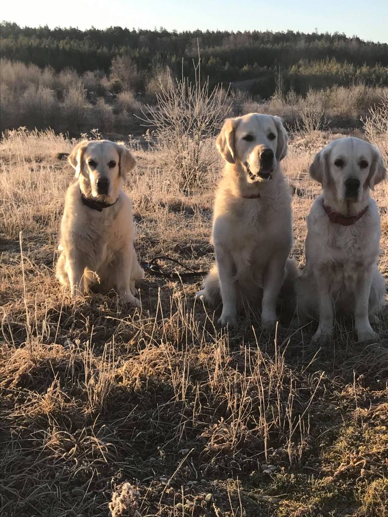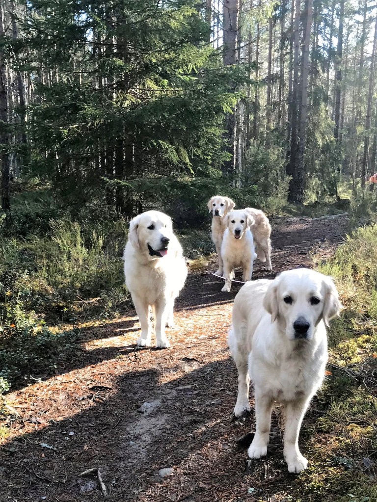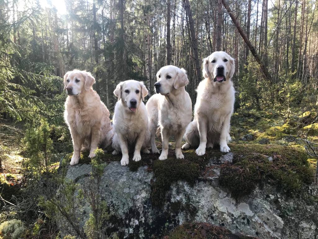 Morgonpromenad, hur skönt är det inte att börja dagen med en härlig promenad i det fina vädret, solen skiner man blir så glad 🙂 Det blev en runda på 4 km, en bra start på dagenVi älskar att vistas i skogen . Efter lunch gick vi en lång promenad tillsammans med kompisen Casper och hans matte Hela gänget posera så fint uppe på en sten.. från vänster kompisen Casper sedan Skye och Rosie och Lazer Det varvas med lek och bus med lugna promenader. Vi njuter även av solen och fågelkvittret denna fina dag. Det är så rogivande att vistas i skogen. Vi var ute i ca 2 timmar.