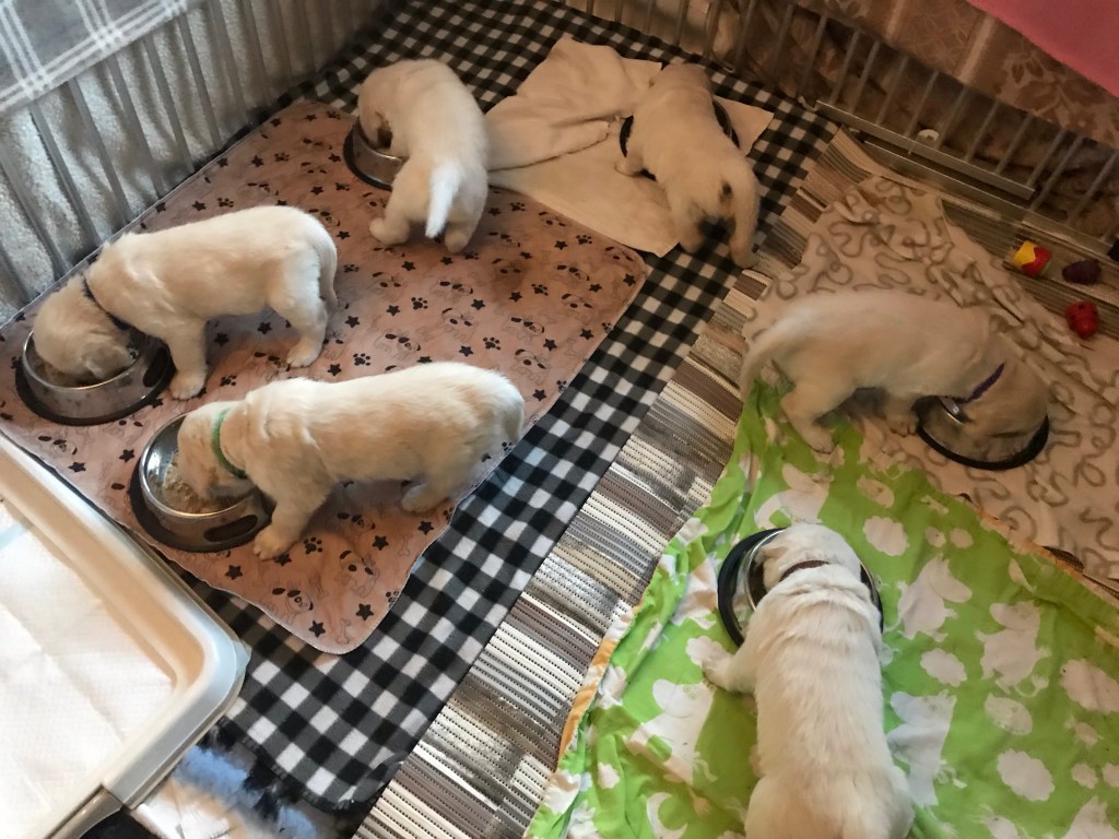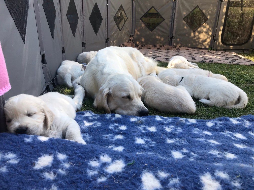 Nu gĂ„r valparnas utveckling vĂ€ldigt fort. đŸDet hĂ€nder saker varje dag. De blir mer och mer hundar och smĂ„ personligheter börjar utkristallisera sig. Nu i veckan har det ocksĂ„ varit tid för dem att fĂ„ trĂ€ffa vĂ„ra barnbarn och de eventuella valpköparna samt kenneln övriga vuxna hundar. Allt detta sker under mammans vakande öga. De fĂ„r Ă€ven nu vara lĂ€ngre stunder i vĂ„rt kök tillsammans med oss och de andra och de fĂ„r vistas sĂ„ mycket som möjligt utomhus. Börjat Ă€ta ur egna skĂ„lar.. sĂ„ de vĂ€njer sig att Ă€ta sjĂ€lva utan syskonrivalitet och jag ser att alla fĂ„r i sig sin portion .. De Ă€ter med god aptit. De har alla passerat 3 kg och Ă€r snart en 4 kg gĂ€ng đŸ Valparna Ă€lskar att vistas utomhus och ta sig en tupplur pĂ„ grĂ€smattan đŸ De Ă€r nu mycket upptĂ€ckslystna och nyfikna pĂ„ allt vad livet har att erbjuda och det Ă€r full fart dagarna i Ă€nda. Tur att de sover en hel del oxĂ„ đ Rosie Ă€r nu inte lika mycket med valparna utan har mer och mer börjat Ă„tergĂ„ till sitt vanliga liv med de övriga hundarna och matte och husse. Hon kan vĂ€lja sjĂ€lv om hon vill sova hos dem pĂ„ nĂ€tterna och hon kan alltid sjĂ€lv bestĂ€mma om hon vill umgĂ„s med dem. Det var allt för denna gĂ„ng đ kram đ€