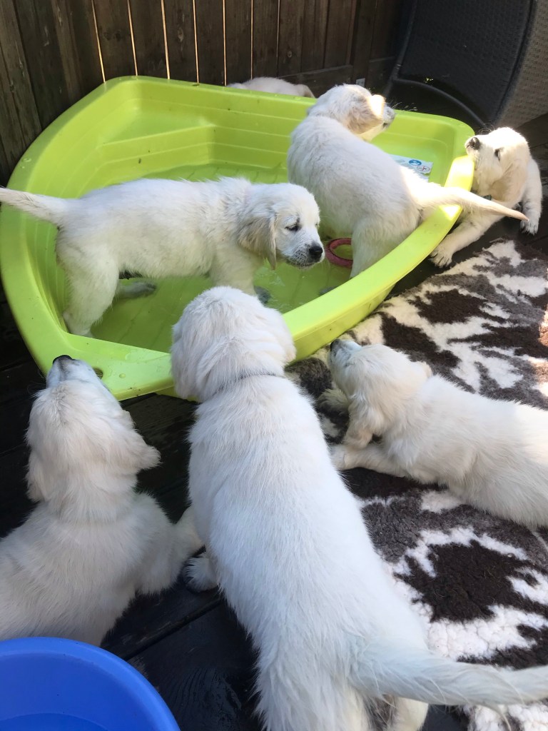 Under förmiddagen blev vatten lek och sedan Ät de mat efter det sÄ vilade de sig pÄ grÀsmattan i valphagen ett litet tag. Somnade av ljudet av grÀsklipparen
