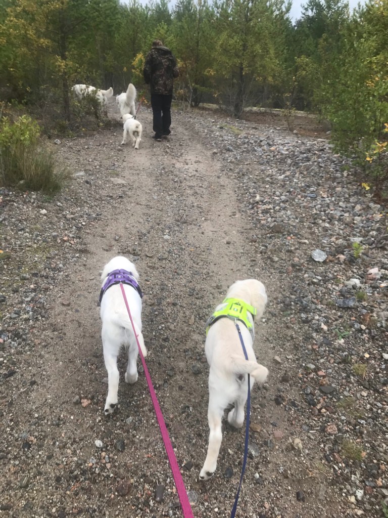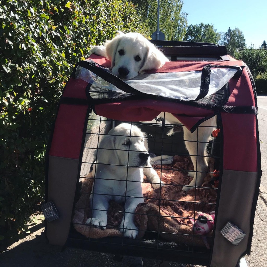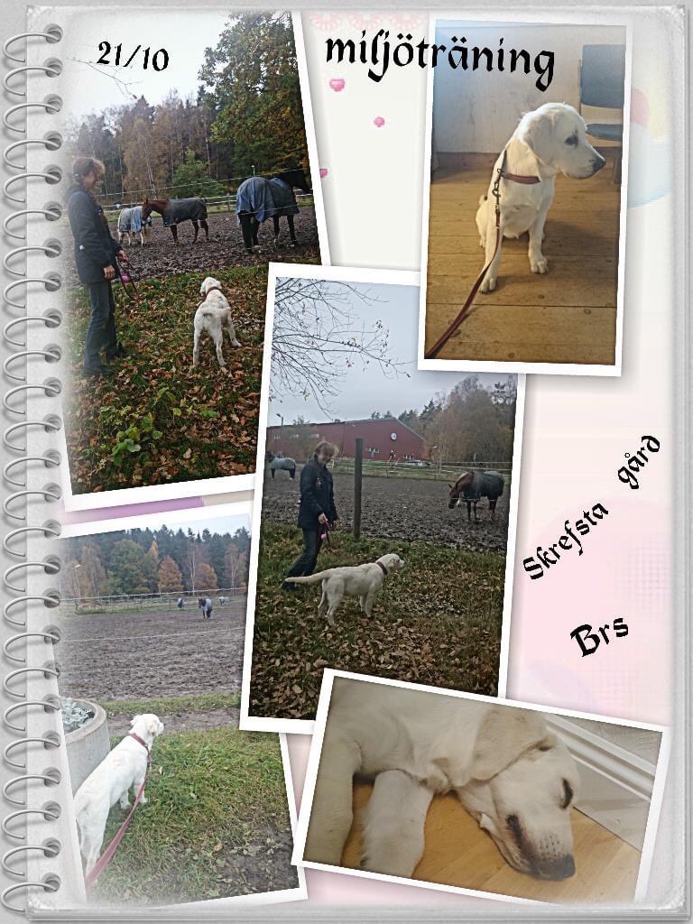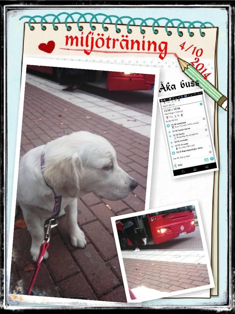Bild: på väg till veterinären, de ska få sin 2a vaccination. 💉 torsdag 10 september-20 🍂 12 -16 Veckor Valparna kan nu börja visa lite tecken på dominas. De leker längre stunder mera än hälften av sin vakna tid och tränar samtidigt upp både sina muskler och sinnen. Nu ökar även testosteron halten både hos hanar och tikar. Lusten att dominera ökar under denna period vilket gör att valparna kan vara kaxiga. Lek gärna nere på golvet med valpen på så sätt stärks bandet mellan er. När det blir för hårda tag ”bitande” så reser du bara dig upp och går därifrån, så kommer valpen snart inse att bitande innebär att leken tar slut. Miljöträning Ta gärna valpen till olika platser där den själv får möjlighet att utforska och låta valpen gå fram och lukta i sin egen takt. Viktigt att ge valpen en chans att våga sig fram till föremål och platser som verkar skrämmande. Ge valpen beröm om den går fram. Om den inte går fram kan man fortsätta promenaden. Men ibland kan det finnas situationer där det är nödvändigt att hjälpa till, då är det viktigt att man är lugn och inge trygghet. Är valpen tveksam för något så kan man själv gå fram, sätta sig på huk framför föremålet, kanske röra på föremålet som man samtidigt lockar på valpen, uppmuntrar med lugna ord och godis. Viktigt att du inte förstärker valpens rädsla, utan agera normalt. Det är helt naturligt att Valpen kommer att visa rädsla i olika miljöer och situationer. Om det blir för mycket för valpen är det bättre att gå lugnt därifrån. Man kan komma tillbaka en annan gång. Bättre att träna korta stunder. När valpensstressreaktion gradvis lugnat sig kommer den titta på dig och ta över din reaktion. Bra om valparna har hunnit uppleva många olika miljöer innan de har fyllt Ett år. Några exempel: åka Bil, Buss, Båt, Tåg och hiss. Gå på stan, gå i skogen. Bada i sjön/havet Följa med till jobbet, följa med på restaurang, ridstallet eller att bara sitta och titta utanför en busstation/ skola eller köpcentrum, bra att vara/uppleva olika miljöer med sin valp ger intryck och lära för livet 💕Bilder på Skye när hon var valp 💜Bra att låta valpen få uppleva nya saker i sin egen takt!Träna följsamhet med Millie & Moa & Max