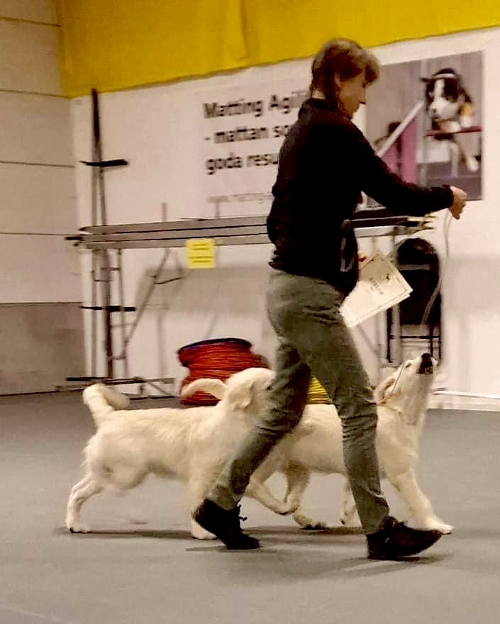 Bozz och Nellie första utstĂ€llning, pĂ„ deras 4 mĂ„naders dag. De var sĂ„ duktiga i denna lilla hall med fullt med folk och mĂ„nga hundar. Först ut var Bozz âą han gick i ringen med en fin attityd och stolt hĂ„llning, han vann sin klass med HP . Fick fin kritik . Sedan var det syster Nellieâs âątur att stĂ€llas i ringen.. Ă€ven hon vann sin klass ned HP (HP= Hederspris)