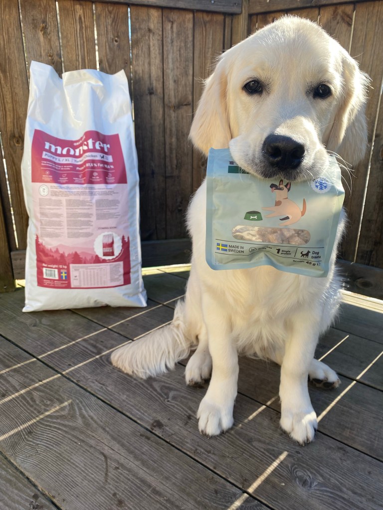 Monster Dog Puppy Large & XL Grain Free Turkey & Chicken och i munnen hÄller han en liten pÄse med Monster Dog Treats