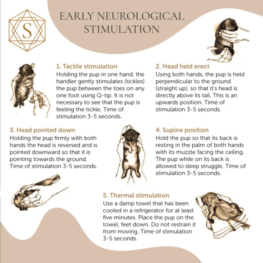 ENS består av fem små övningar, som bara tar några sekunder och stimulerar valpens nervsystem på ett skonsamt och kontrollerat sätt. Det stärker förmågan att klara av stress, utvecklar balans och ger valparna en bättre förmåga att anpassa sig till världen utan att få panik eller stelna.