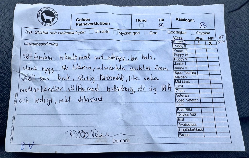 - Hon har deltagit i officiella utställningar, bland annat i Leksand 2023 där hon fick bedömningen ”Excellent” i juniorklassen.