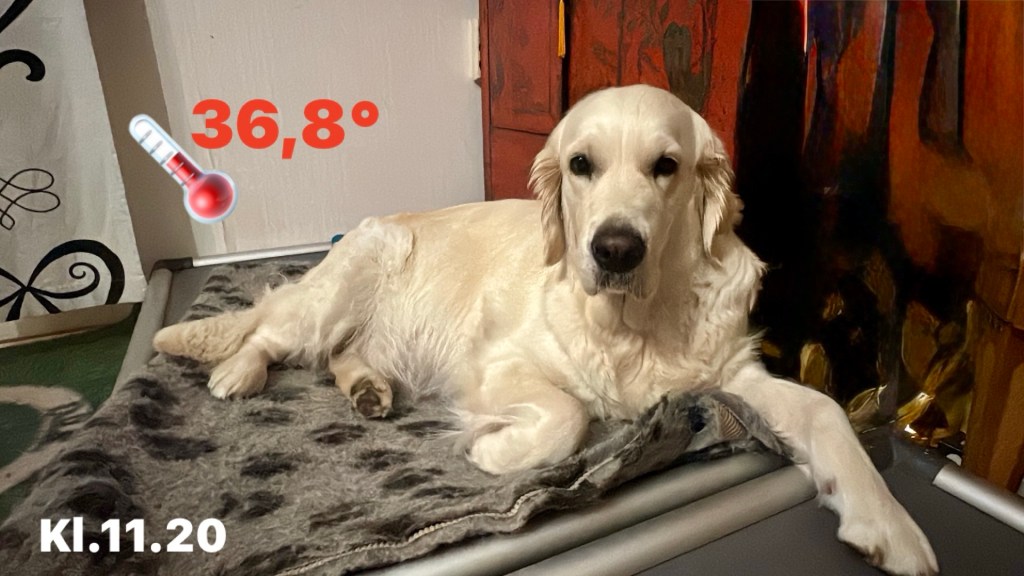 För i sista veckan börjar tempen pendla upp och ner för att nÄgot dygn innan valpningen göra en rejÀl dykning, kanske ner till 36 grader.